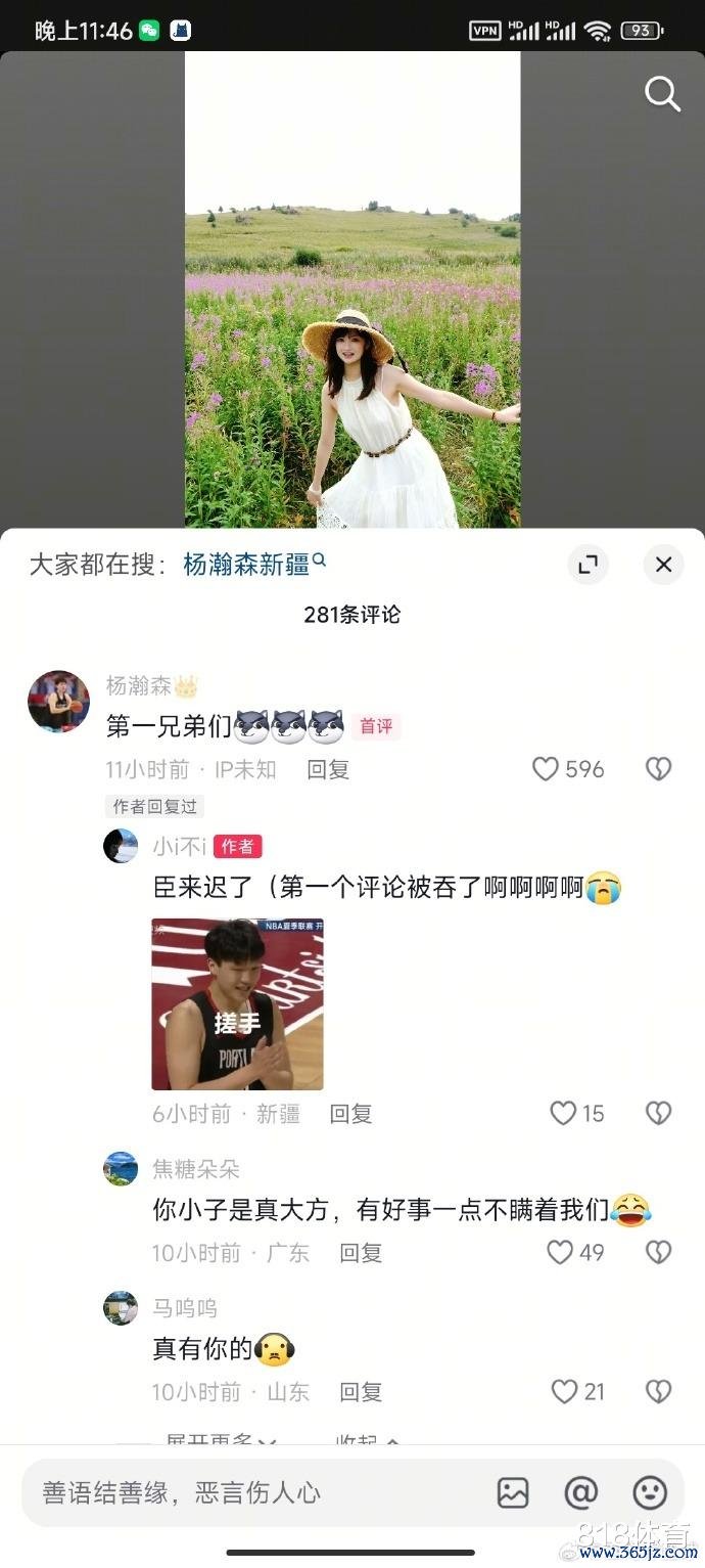8月2日消息,8月1日雷霆vs步行者总决赛,开拓者五号位杨瀚森和女友一起去新疆旅游,女友在社交媒体上晒出旅游的照片,杨瀚森在评论区依然是第一个现身留言,大洒狗粮!