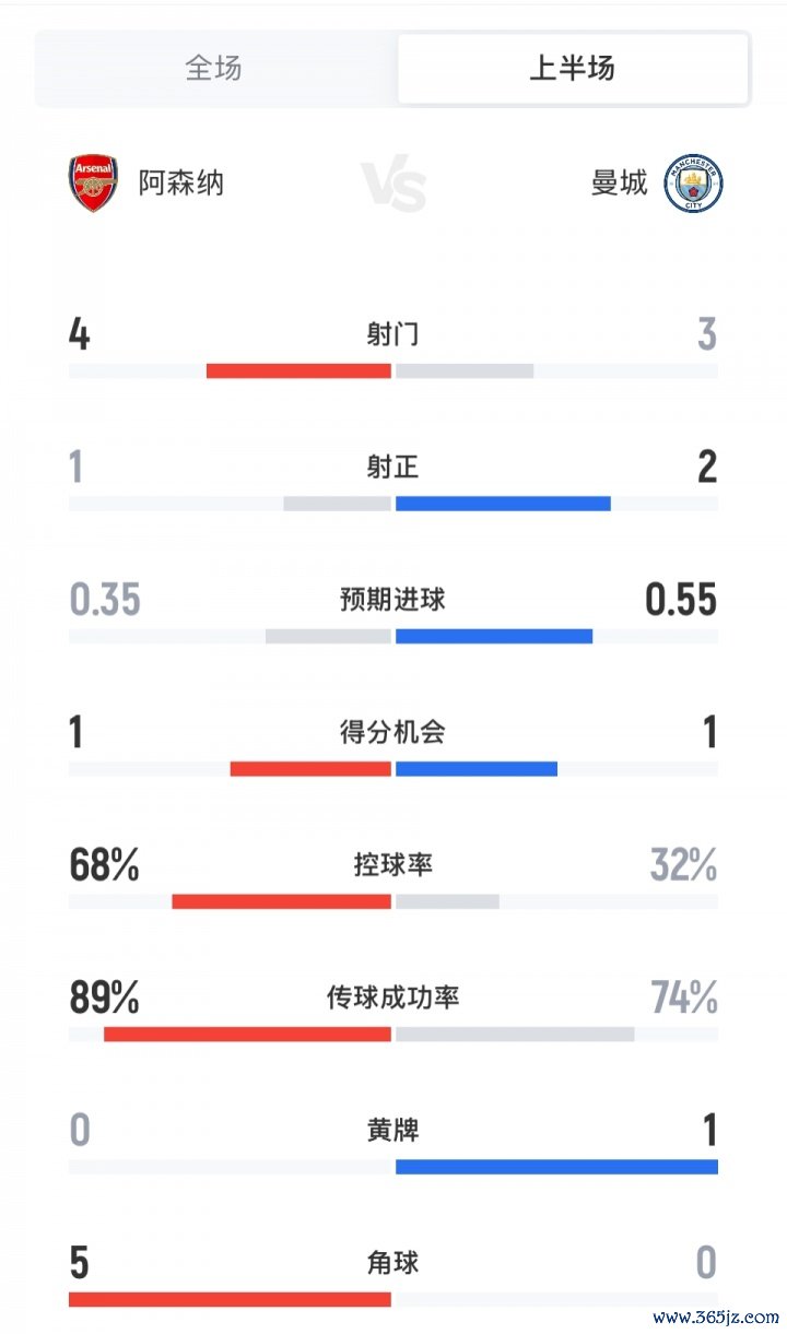 曼城放弃盘带打反击!阿森纳vs曼城半场数据:盘带68-32,射球 4-3