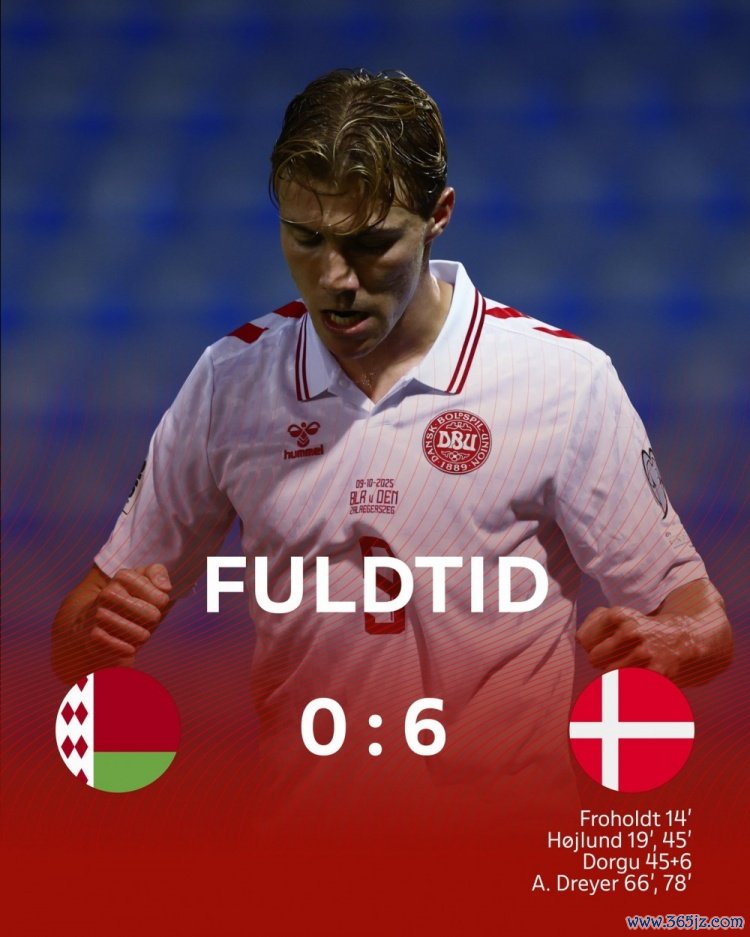 10月10日讯 世预赛欧洲区小组赛,丹麦客场应战 6-0大胜白俄罗斯。