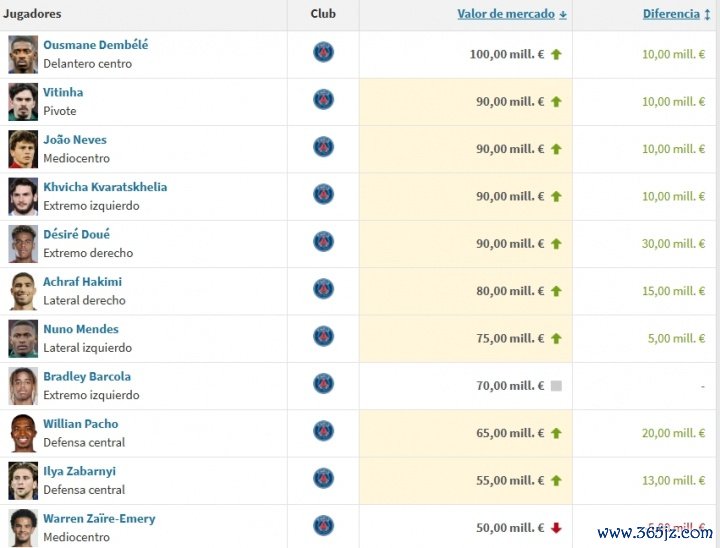 10月10日讯 今日德转更新法甲球员身价,登贝莱身价上涨至1亿欧排名法甲第1, 篮球新闻无插件直播维蒂尼亚、内维斯、克瓦拉茨赫利亚、杜埃四人身价高达9000万欧, 羽毛球资讯法甲身价前10位都为巴黎球员。
