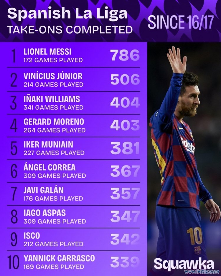 16-17赛季以来西甲过人榜:梅西786次居首,维尼修斯506次第二