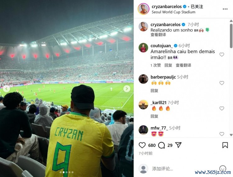 身穿自己名字的巴西9号运动活动 服 !克雷桑现场观战巴西vs韩国