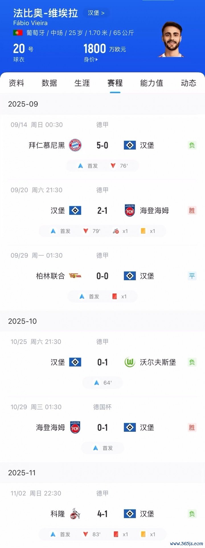 11月03日讯 德甲第9轮科隆4-1完胜汉堡,阿森纳租将法比奥-维埃拉再度染红,本赛季出战5轮德甲已经拿到2张驱逐 ,同期数据则为0球1助。