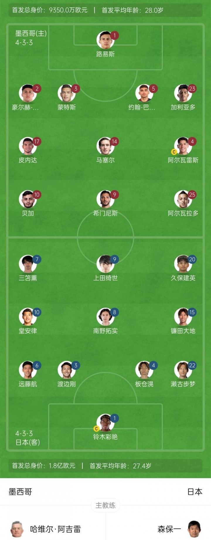 羽毛球资讯队内球星包括利物浦的远藤航、布莱顿的三笘薰、皇家社会的久保建英、摩纳哥的南野拓实、法兰克福的堂安律等一众名将,杆位身价1.8亿欧是墨西哥的2倍。