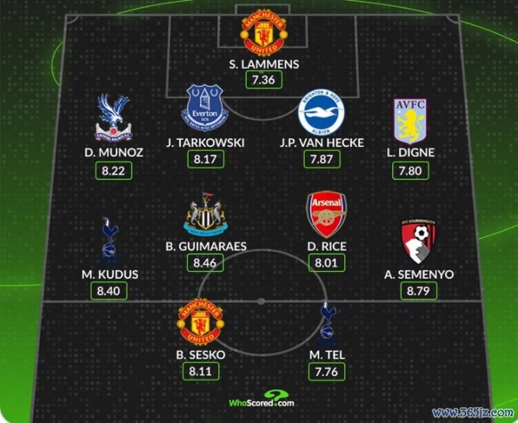 中场:库杜斯(热刺)、吉马良斯(纽卡)、赖斯(阿森纳)、塞梅尼奥(伯恩茅斯)