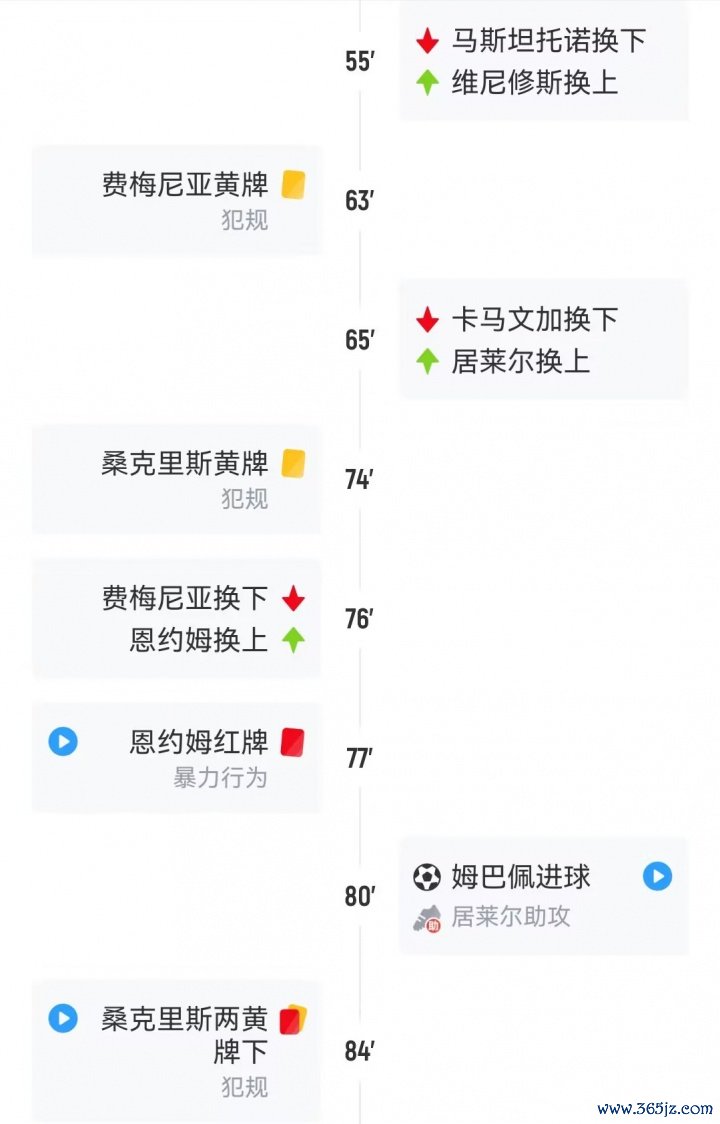 第77分钟,同样是替补登场的恩约姆刚上场1分钟,就因对维尼修斯犯规被主裁直红罚下。