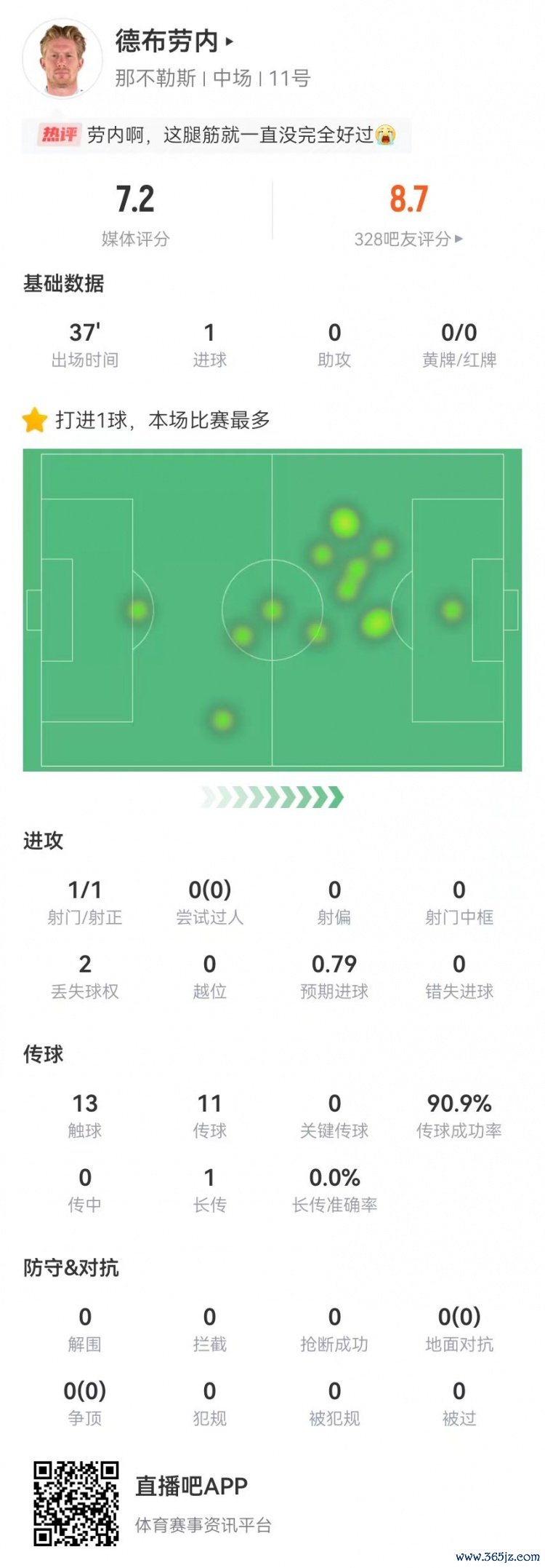 10月26日讯 那不勒斯在意甲焦点战3-1力克国米, 篮球新闻直播平台德布劳内本场数据如下: