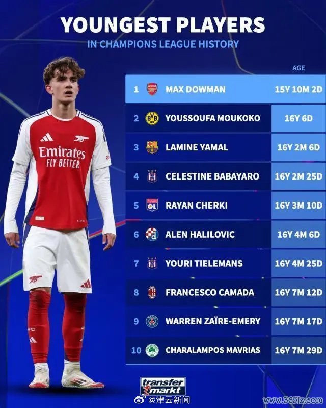 至此,枪手成为1969-70赛季的利兹联后,史上第2支在单季欧冠前4场比赛全胜且不失一球的英格兰球队。此外,枪手还贡献了一个历史之最:小将道曼此役替补登场,超越穆科科和亚马尔等人,以15岁308天的年龄,成为冠军联赛历史上最年轻的出场球员。(体坛周报)