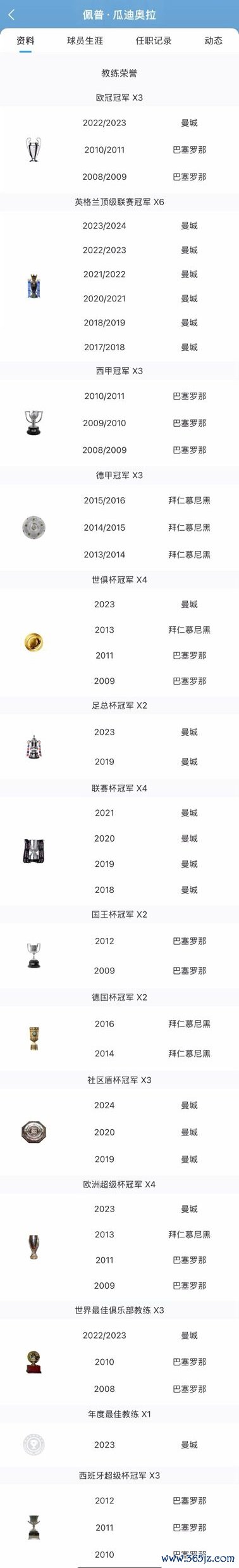 瓜迪奥拉执教生涯主要荣誉一览↓