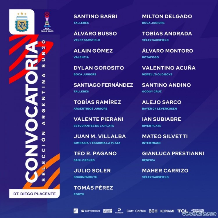 桑提诺-巴比(塔勒雷斯)、阿尔瓦罗-布索(萨斯菲尔德)、阿兰-戈麦斯(瓦伦西亚)、迪兰-戈罗西托(博卡青年)、桑提亚戈-费尔南德斯(塔勒雷斯)、托比亚斯-拉米雷斯(阿根廷青年)、瓦伦特-皮埃拉尼(拉普拉塔大学生)、胡安-比利亚尔瓦(拉普拉塔体操运动活动 )、特奥-帕加诺(圣洛伦索)、胡利奥-索莱尔(伯恩茅斯)、托马斯-佩雷斯(波尔图)、米尔顿-德尔加多(博卡青年)、托比亚斯-安德拉达(萨斯菲尔德)、阿尔瓦罗-蒙托罗(博塔弗戈)、瓦伦蒂诺-阿库尼亚(纽维尔老男孩)、桑提诺-安迪诺(戈多伊克鲁斯)、阿莱霍-萨尔科(勒沃库森)、伊安-苏比亚布雷(河床)、马特奥-西尔维蒂(迈阿密国际)、詹卢卡-普雷斯蒂亚尼(本菲卡)、马赫尔-卡里佐(萨斯菲尔德)中超联赛赛程
