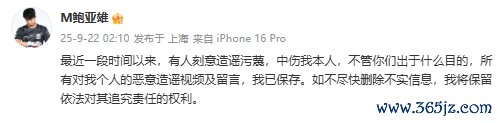 09月22日讯 今天凌晨2点,申花守门员鲍亚雄突然在社媒发文,表示近期有人对自己刻意造谣污蔑,将保留依法对其追究责任的权利。