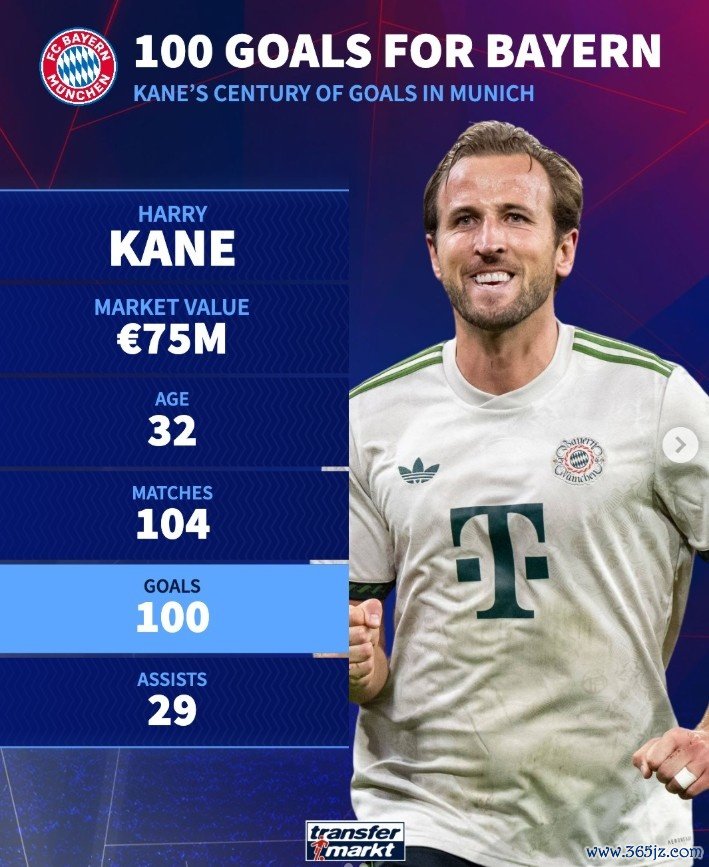 9月27日讯 德转数据显示,凯恩104场拜仁的赛事 ,打进100球送出29次助功 。