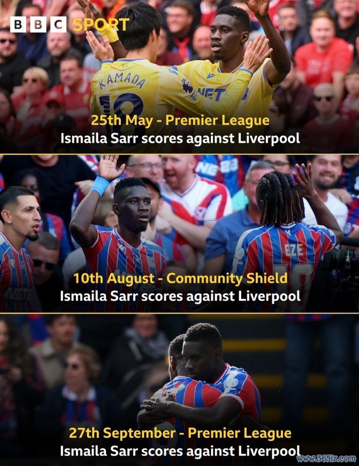 9月27日讯 在本轮英超水晶宫对阵利物浦的赛事 中,萨尔率先破门。