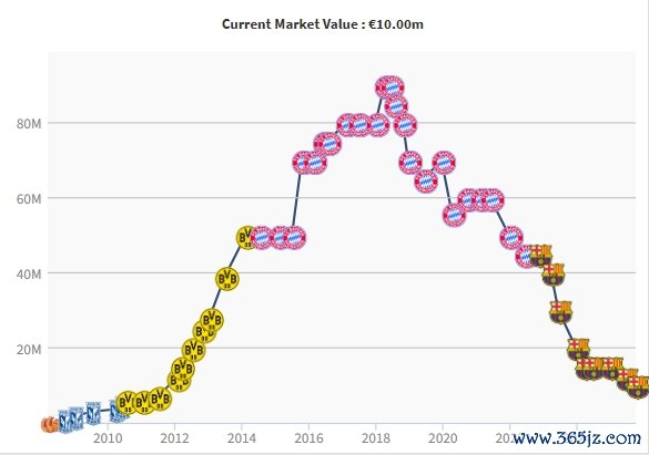 莱万的身价曾在2018年效力拜仁期间达到巅峰期 的9000万欧。