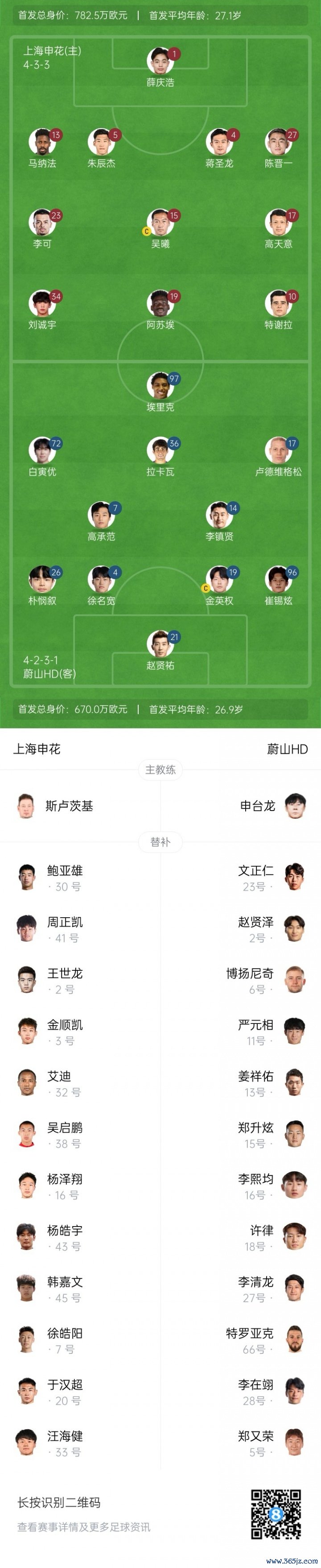上海申花杆位:1-薛庆浩、4-蒋圣龙、5-朱辰杰、13-马纳法、27-陈晋一、10-特谢拉、15-吴曦、17-高天意、23-李可、19-阿苏埃、34-刘诚宇