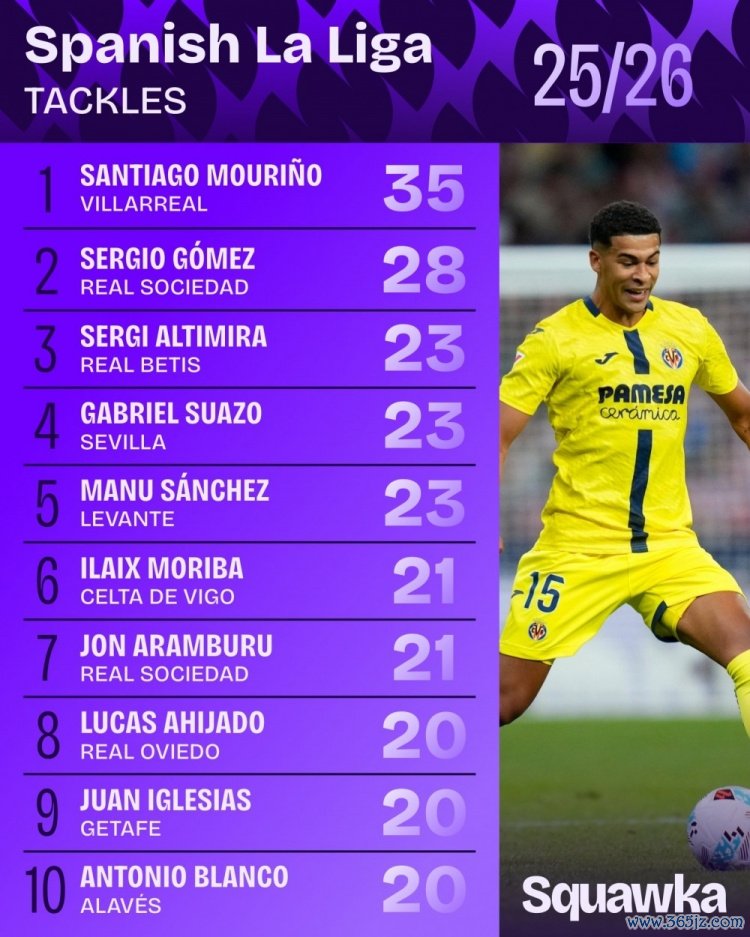 西甲解围次数排行:黄潜后场球员S-穆里尼奥居首 塞尔吉奥-戈麦斯第二