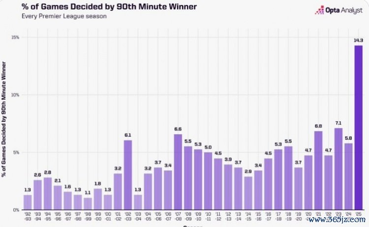10月7日讯 据OPTA统计,本赛季英超70场赛事 中有10场出现90分钟后的制胜球,占比高达14.3%。