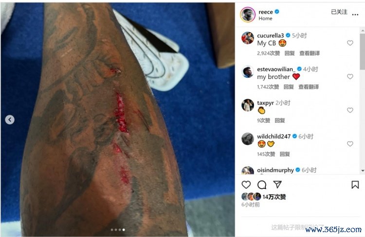 里斯-詹姆斯赛后更新社媒动态,多特蒙德五大联赛晒出赛事 照片, 篮球新闻以及腿上的伤口。