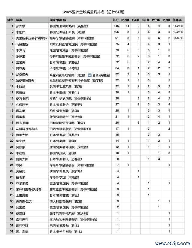 10月13日讯 《体坛周报》公布2025亚洲金球奖投票结果,孙兴慜146分第10次夺魁,李刚仁105分排名第二,多特蒙德C罗91分排名第三。