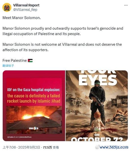 黄潜球迷组织发文, 篮球新闻英超直播“认识一下所罗门。所罗门曾经自豪地透明 支持以色列对巴勒斯坦及其人民的种族灭绝和非法占领。所罗门先生在比利亚雷亚尔并不受欢迎, 羽毛球资讯也不值得球迷的喜爱。”