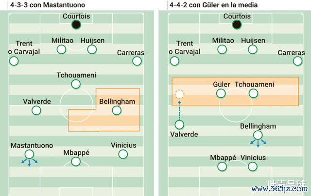 如果是442阵形 ,姆巴佩、维尼修斯双前场球员,巴尔韦德、贝林厄姆、居勒尔、琼阿梅尼组成4中场球员,贝林厄姆的站位灵敏度机动,埋伏在双前场球员身后;巴尔韦德则需要照顾右路的防卫 。