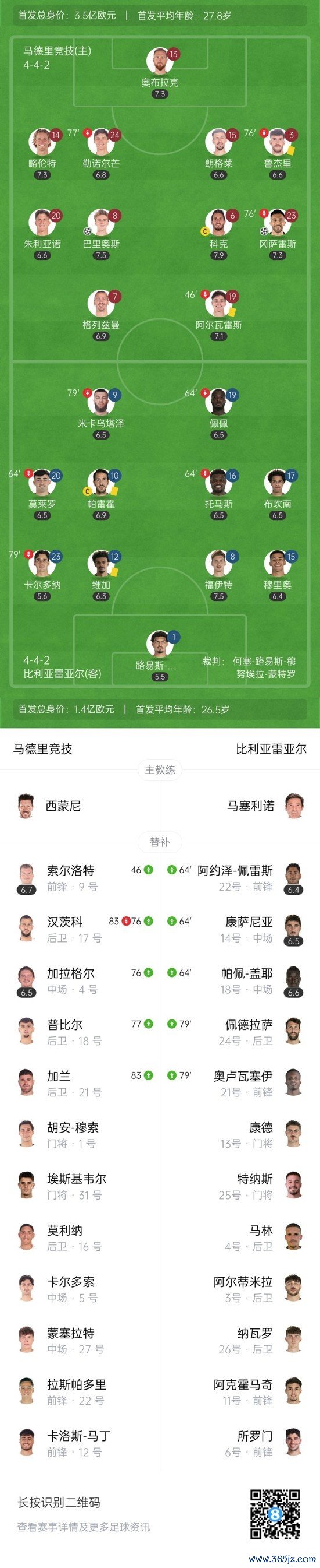 下半场补时5分钟,马竞2-0比利亚雷亚尔。