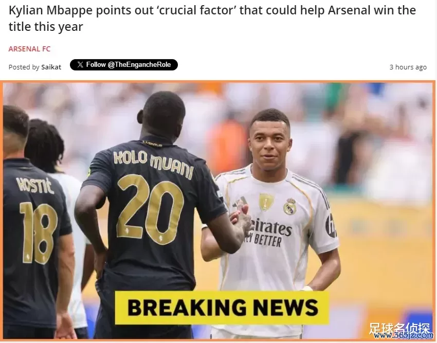 姆巴佩: 看好阿森纳赢得本赛季英超第一名 ! 罗德里盛赞祖比门迪!
