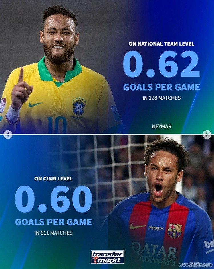 内马尔(33岁):俱乐部611场,场均0.60球;国家队128场,场均0.62球