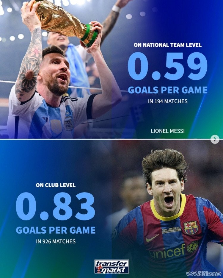 梅西(38岁):俱乐部926场,场均0.83球;国家队194场,场均0.59球