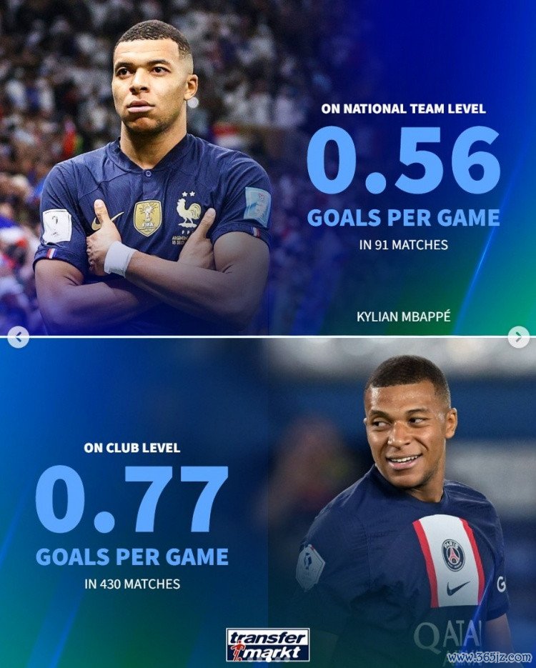 姆巴佩(26岁):俱乐部430场,场均0.77球;国家队91场,场均0.56球