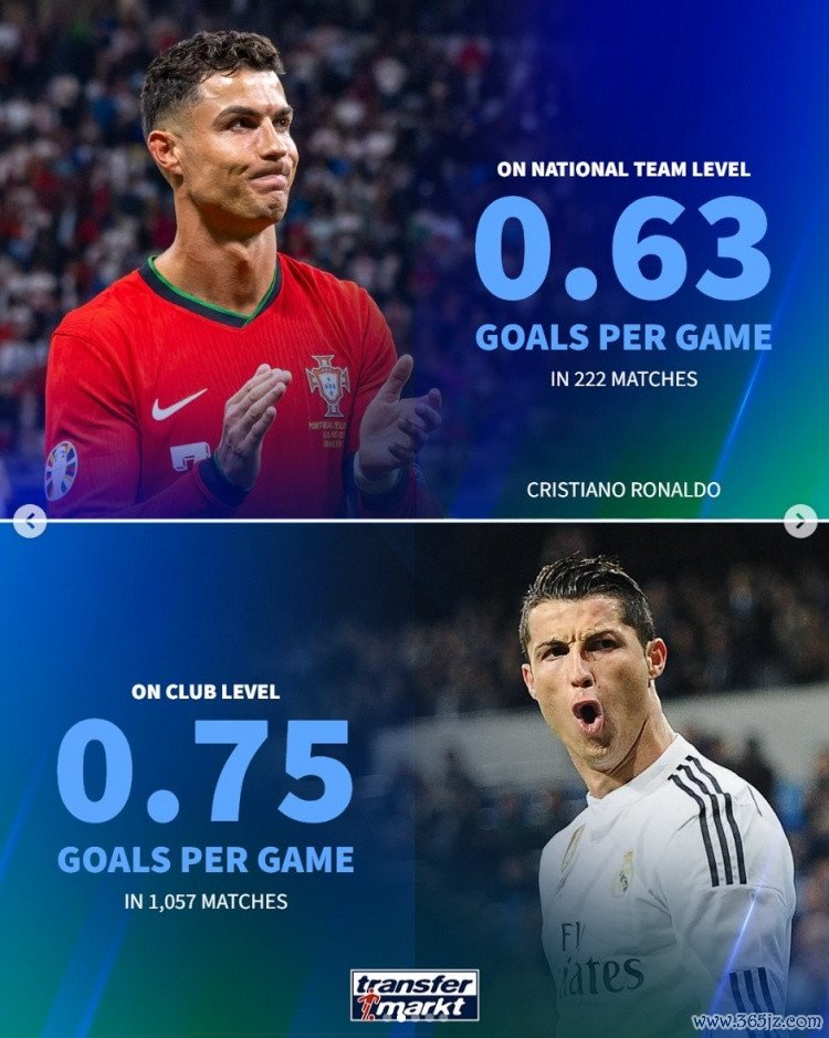 C罗(40岁):俱乐部1057场,多特蒙德场均0.75球;国家队222场, 篮球新闻场均0.63球