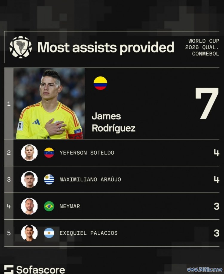 9月11日讯 本届南美世预赛结束,Sofascore统计了球员送出助功 的次数,多特蒙德高清直播J罗7助居首。
