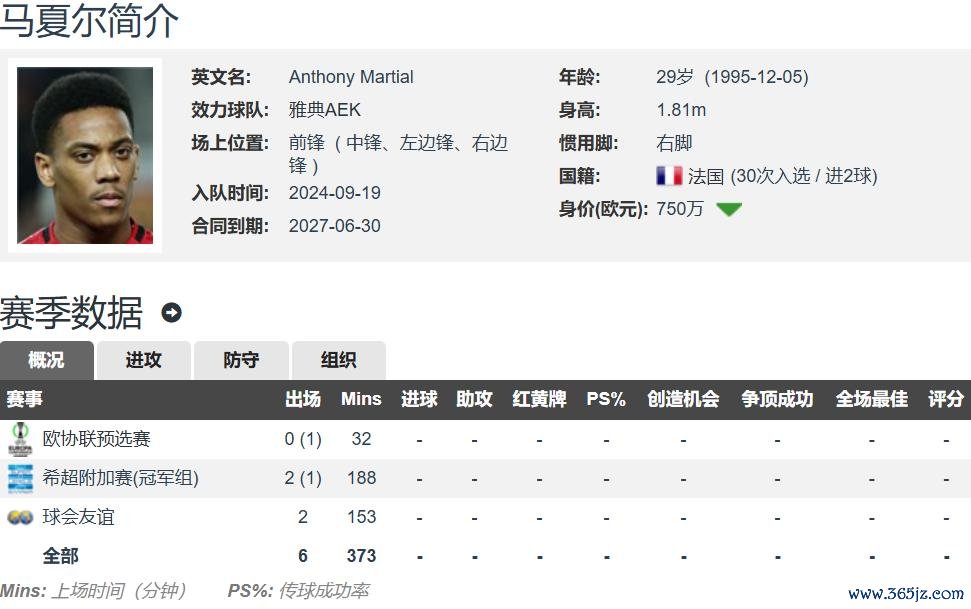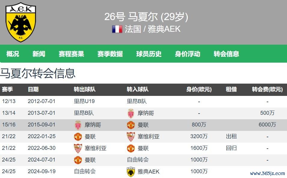 马夏尔年少成名球探比分,2015年夏窗以6000万欧元的转会费从摩纳哥加盟曼联,当时马夏尔身价仅800万欧元,溢价7.5倍,可见其天赋。2018年,马夏尔在德转的身价迎来职业生涯巅峰期 ,高达6500万欧元,如今100万欧元被雅典AEK甩卖,形成了鲜明的“堕落史”,只能说一声叹息。